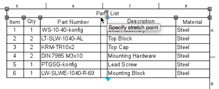 Part List Enhancements – In a large assembly, some part’s lists are so long they are run off the page. This was an issue. Now we can split the parts list by grabbing the blue grip handle. In addition, we can change the width of the columns by grabbing the grey grip handles to customize the size of the parts list.